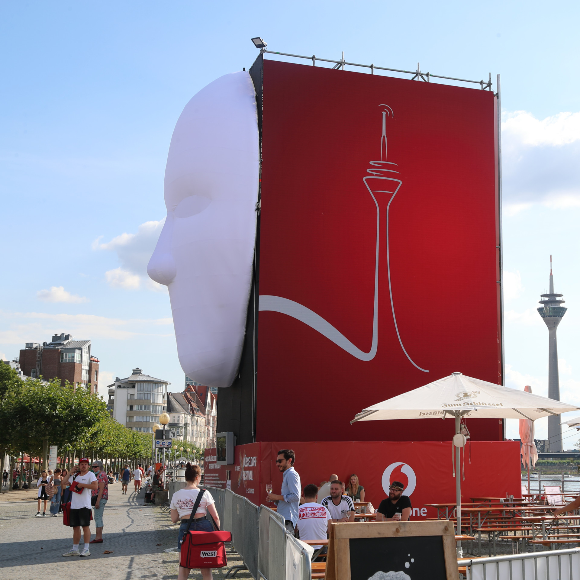 Ernst, freundlich, lächelnd und mit Grimasse – Gesichter in diesen vier Ausdrücken zeigte das Projekt „Faces“ des Künstlers Jan Ising während des Düsseldorf-Festivals vergangenes Jahr. Die Botschaft: Egal, welche Hautfarbe wir haben oder wie wir aussehen, wir sind alle Menschen. Um das zu verdeutlichen wurde auf dem Burgplatz der Stadt eine acht Meter große Halbmaske aufgehängt. Täglich mit Anbruch der Dämmerung wurden dann über Projection Mapping-Technologie rund 400 zuvor aufgezeichnete Gesichter auf „einem Kopf“ gezeigt.